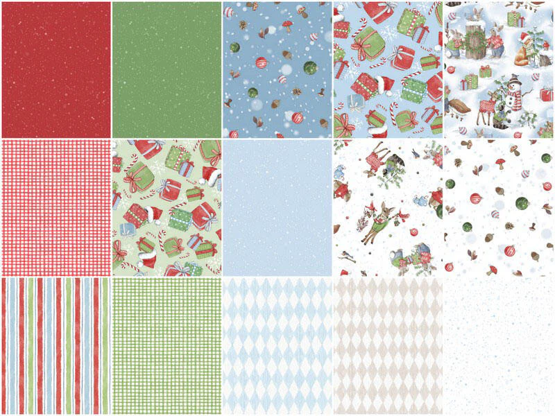 Layer cake of Christmas and winter prints. Create a storybook Christmas with Frost & Fable. This cheery winter-themed collection by Leslie Trimbach for P & B Textiles includes lots of red, green, blue, and white that bring to mind traditional Christmas and winter colors. Cute deer, snowmen, gifts, and ornaments are complemented by stripes, checks, and geo prints.
