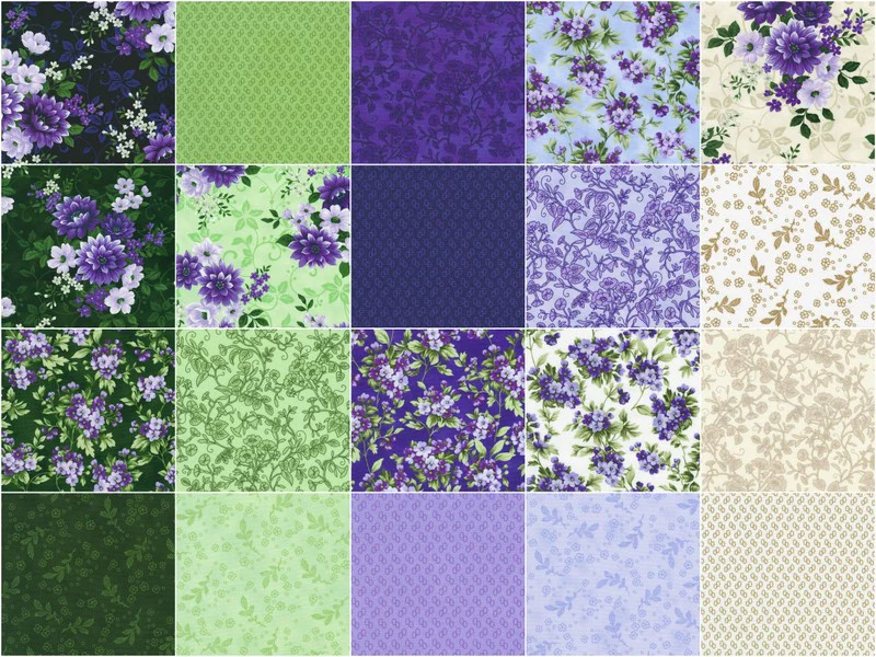 Charm pack of floral prints in purple and complementary colors. Lavender, lilac, amethystâŠall the purples are here in Georgina! Debbie Beaves created this garden of beautiful flowers for Robert Kaufman Fabrics. Purple takes center stage, complemented by pretty green, soft ivory and other colors that create a lovely palette for your next project.