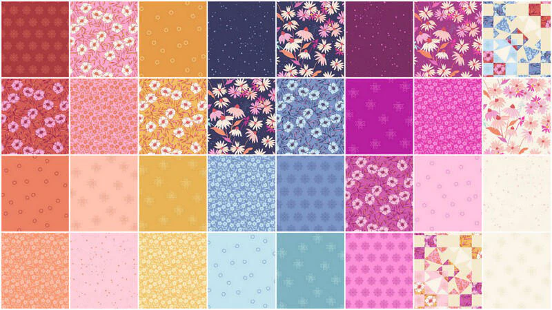 Charm pack of floral and quilt prints in pinks, blues, coral, yellow, and rust. Quilt blocks and flowers combined in one color-coordinated collection? Yes, please! Petals and Stitches does just that. This pretty line by Stephanie Organes for Andover features ditsy flowers and dots, graceful blooms, Dresden flowers, and quilt block designs in lovely spring and summer colors.